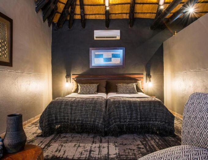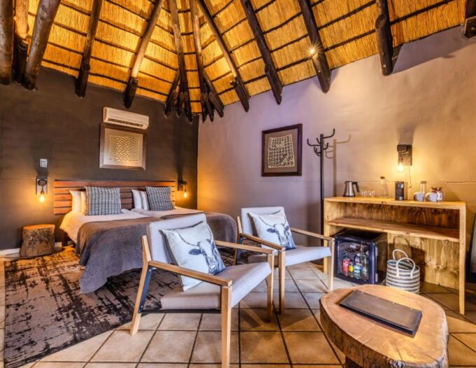Le lodge s’intègre harmonieusement dans le paysage grâce à des structures basses, des matériaux naturels et des couleurs inspirées du terrain. Son architecture met en valeur les formations rocheuses de l’Erongo tout en offrant des espaces ouverts qui invitent la lumière à entrer. Les bâtiments se déploient autour de la piscine, des jardins et de la terrasse, créant un ensemble cohérent où chaque élément semble prolonger le décor naturel. La décoration intérieure, pensée avec sobriété, privilégie les textures naturelles, les bois clairs et les teintes chaudes. L’ensemble dégage une atmosphère douce et authentique, idéale pour un séjour tourné vers la découverte et le repos.