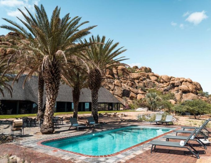 La piscine extérieure du lodge constitue un espace privilégié pour savourer la douceur des journées namibiennes. Placée au milieu des rochers et entourée de végétation clairsemée, elle offre une vue dégagée sur les collines lointaines. La fraîcheur de l’eau contraste agréablement avec la chaleur du désert, créant un moment de détente profond. On y passe volontiers de longues heures, à lire, à observer ou à profiter de l’ombre d’un parasol. La piscine devient le cœur du lodge, un lieu où la lumière joue avec les reliefs pour composer un tableau changeant tout au long de la journée.