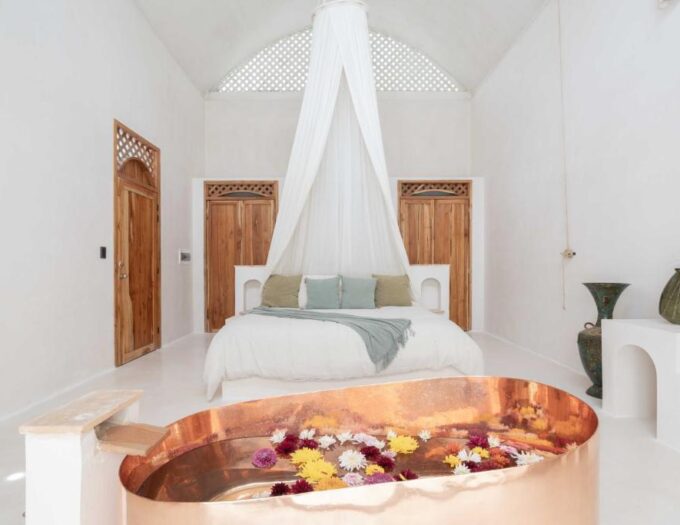 L’architecture de l’Anat Tantric Lodge privilégie les courbes douces, les matériaux naturels et une intégration respectueuse dans son environnement tropical. Les structures, baignées d’une lumière tamisée par la végétation luxuriante, invitent au calme dès le premier regard. Le design intérieur, aux accents bohèmes et raffinés, utilise des textures qui sollicitent le toucher — bois poli, textiles naturels et pierres fraîches — créant un environnement où chaque recoin est une invitation à la contemplation.