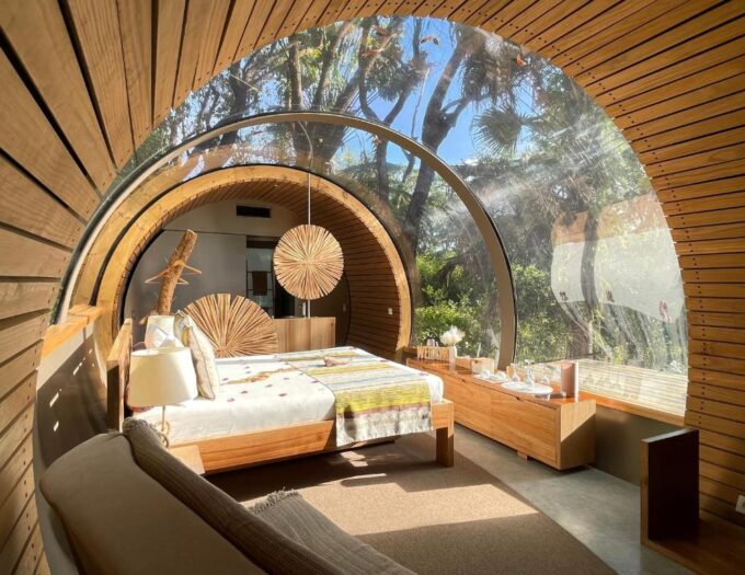 Les intérieurs des bulles sont décorés dans des tons ocre et des tissus naturels, créant une atmosphère chaleureuse en harmonie avec le paysage. Chaque bulle comprend un lit double et une salle de bains privative. Le détail le plus charmant est sans doute la douche extérieure à ciel ouvert, un moment de soin en contact direct avec la lumière et l’air pur. Pour les familles, un canapé-lit peut accueillir jusqu’à deux enfants (âgés de 14 ans et moins), soulignant l’adaptabilité de la retraite.