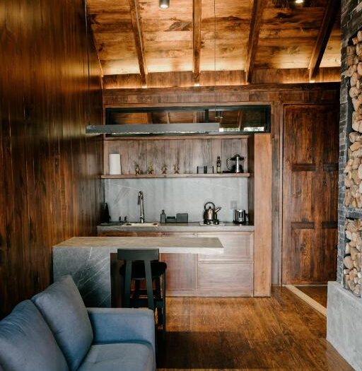 Les chambres, spacieuses et accueillantes, sont conçues comme des nids de chaleur. Le parquet en bois apporte une texture naturelle et une isolation thermique essentielle en altitude. Chaque logement est doté d’un balcon privé, véritable plateforme de contemplation d’où l’on peut observer la danse des nuages dans la vallée. À l’intérieur, le confort est soigné : un bureau pour les esprits créatifs, une armoire généreuse et, surtout, le luxe d’un bain à remous privé pour certains hébergements. Imaginez-vous plongé dans une eau chaude alors que l’air frais de la montagne caresse votre visage. Pour les soirées plus fraîches, les services de streaming et la kitchenette permettent de se créer un cocon autonome, tandis que le Wi-Fi gratuit assure le lien avec le reste du monde.