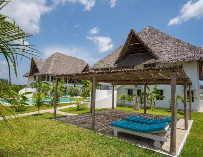 Le lodge dispose d’une piscine extérieure entourée de transats, offrant un espace de détente et de baignade pour les hôtes. Le jardin tropical, soigné et verdoyant, apporte une touche de sérénité et invite à la promenade ou à la lecture en plein air. Une terrasse complète l’expérience, parfaite pour profiter des soirées douces et observer les couchers de soleil typiques de la côte kenyane.