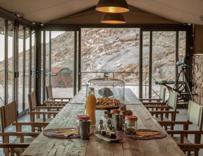 Le restaurant du Camp Sossus Lodge propose une cuisine inspirée des traditions locales, servie dans un espace ouvert qui prolonge l’expérience du voyage. Le petit-déjeuner, disponible en formule buffet, à la carte ou continental, s’adapte aux envies des voyageurs et prépare à une journée d’exploration. La fraîcheur des plats, la simplicité des préparations et la convivialité du service reflètent l’identité du camp.