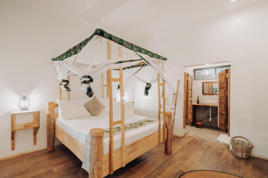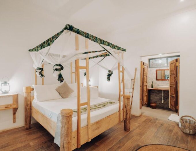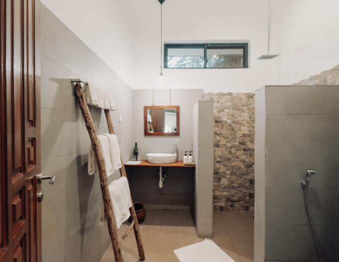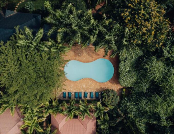 La pièce maîtresse du lieu est sans conteste la piscine extérieure, bordée de verdure, qui offre un refuge rafraîchissant contre la chaleur équatoriale. Autour d’elle, la terrasse est un lieu d’observation et de repos, où l’on peut s’abandonner au silence doux des après-midis. Les espaces communs, incluant un salon partagé et un bar discret, sont pensés pour faciliter la déconnexion et les échanges calmes, loin de l’agitation.