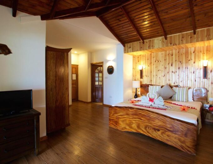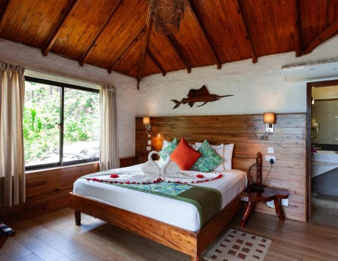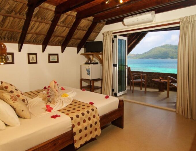 À l’intérieur, les chambres affichent une décoration simple et chaleureuse, ponctuée de tissus colorés et de matériaux naturels. On y retrouve tout le confort moderne : télévision, salle de bains privative, literie soignée et ambiance paisible. L’ensemble respire la douceur de vivre seychelloise, entre artisanat local et panorama maritime.