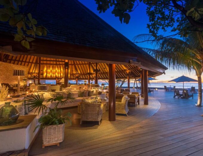 Le soir, les dîners se déroulent souvent sous les étoiles, sur la plage ou près de la piscine, avec le clapotis des vagues pour seul fond sonore. Le bar du lodge, quant à lui, est le lieu privilégié pour savourer un cocktail au coucher du soleil, quand l’horizon se teinte d’or et de pourpre.