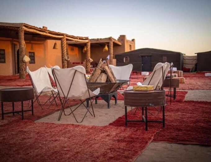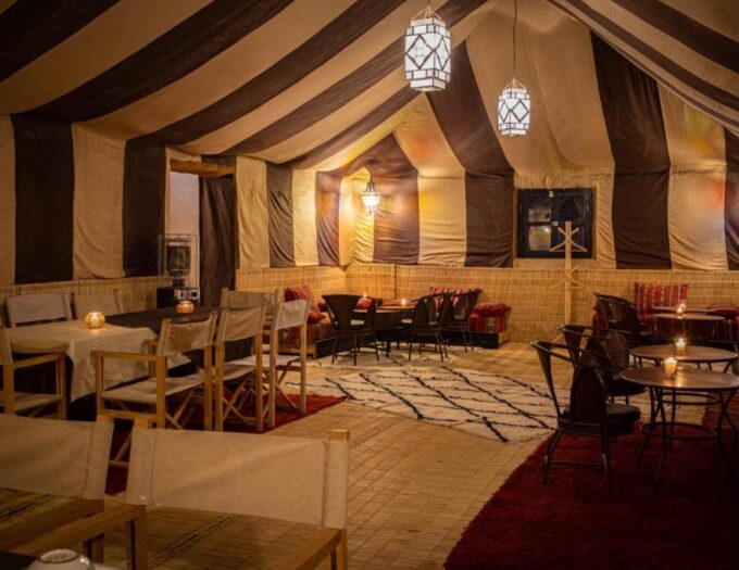 Chaque matin, un petit-déjeuner continental est servi pour accompagner les voyageurs avant leurs explorations. Les repas, souvent partagés dans un cadre ouvert sur le désert, créent une atmosphère conviviale et chaleureuse. Les produits simples et locaux rappellent les traditions culinaires du Sud marocain et s’intègrent harmonieusement dans l’expérience du lodge. Manger dans le désert, entouré du silence et de la lumière matinale ou du crépuscule, transforme chaque moment en une expérience sensorielle et mémorable.