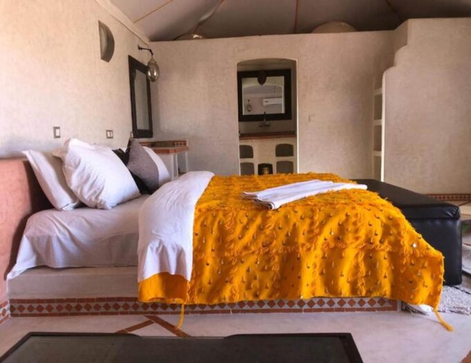 Le lodge se présente comme une halte élégante au cœur du désert. Le jardin, soigneusement intégré au paysage, offre une transition douce entre les espaces de vie et les étendues sablonneuses. Les dunes proches changent de couleur au fil de la journée, passant du beige clair aux teintes plus chaudes du coucher de soleil. Les nuits, quant à elles, se parent d’un ciel étoilé d’une profondeur rare, rappelant la puissance et la beauté intacte de cette région. Chaque moment passé au lodge devient une invitation à contempler la lumière et à écouter le silence, deux éléments essentiels qui composent l’âme de M’Hamid.