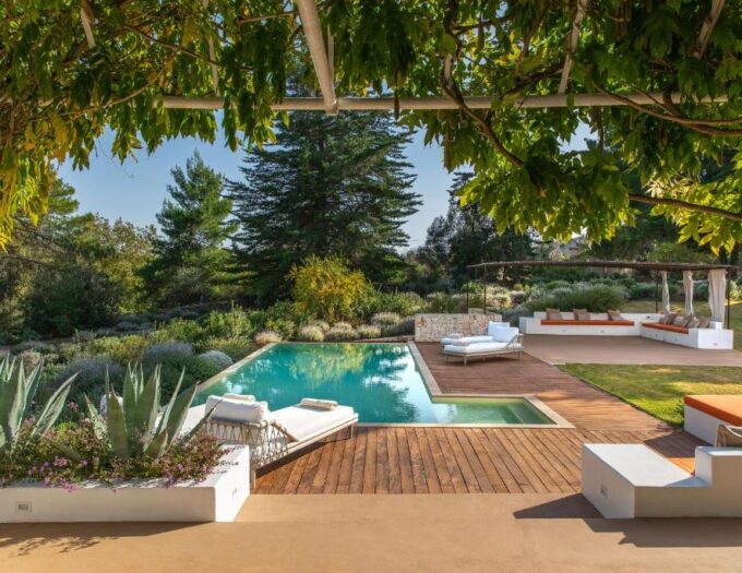 La piscine extérieure, ouverte en saison, offre un havre de fraîcheur et de quiétude, entourée de transats et d’oliviers centenaires. Chaque détail reflète une approche du luxe fondée sur la sobriété, la nature et le bien-être.