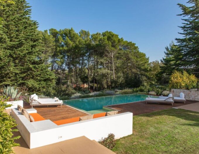 La piscine extérieure, ouverte en saison, offre un havre de fraîcheur et de quiétude, entourée de transats et d’oliviers centenaires. Chaque détail reflète une approche du luxe fondée sur la sobriété, la nature et le bien-être.