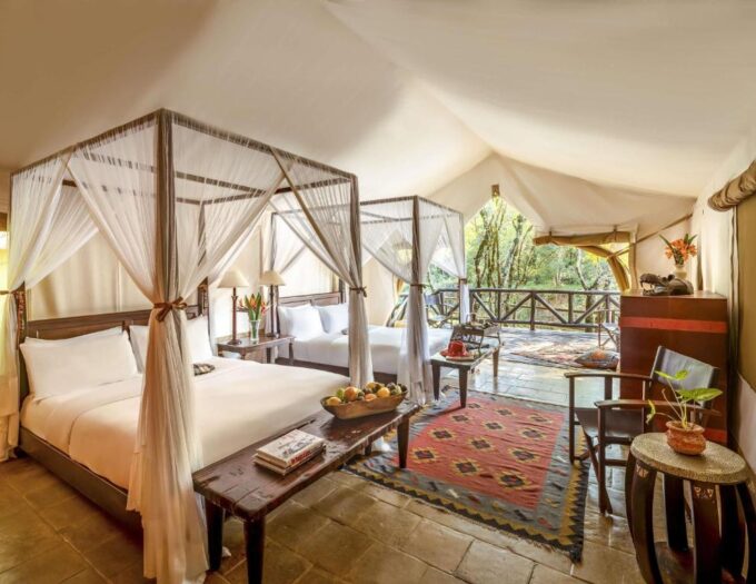 Les tentes du Fairmont Mara Lodge n’ont de « tentes » que le nom. Spacieuses, dotées de lits à baldaquin et d’un mobilier raffiné, elles mêlent esprit safari et confort contemporain. La terrasse privée, donnant directement sur la rivière, devient un espace d’observation privilégié à toute heure de la journée. Certaines tentes offrent même une douche extérieure privée, permettant de se rafraîchir avec, pour seul décor, la nature à perte de vue.
