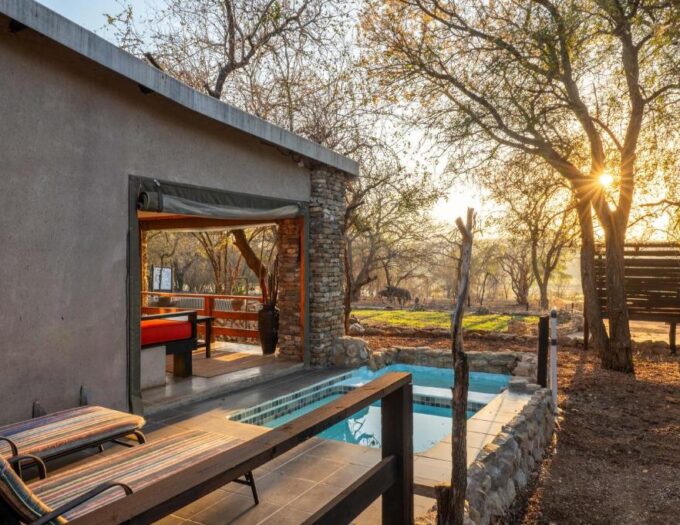 Chaque villa du lodge est conçue pour offrir confort et intimité, avec des espaces ouverts sur la nature environnante. Les logements sont équipés de lits king-size, d’un coin salon avec télévision à écran plat, d’une kitchenette et d’une salle à manger privée. Les salles de bains privatives disposent de douches intérieures et extérieures, tandis que certaines villas supérieures sont pourvues d’une baignoire, permettant de se détendre tout en admirant le paysage. Les terrasses et piscines privées offrent des moments de relaxation incomparables, avec une vue directe sur la rivière Crocodile et les alentours du parc Marloth.