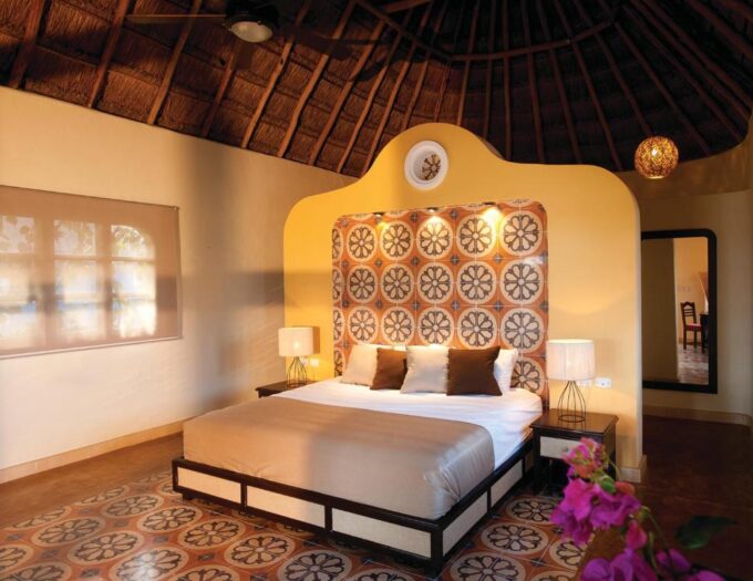 L’architecture de l’Hacienda Viva Sotuta est une célébration du style colonial yucatèque. Les bâtiments principaux, aux plafonds hauts et aux arcades élégantes, ont conservé leur âme d’antan tout en intégrant les exigences du confort moderne. La pierre locale et les couleurs chaudes capturent la lumière tropicale, créant des contrastes saisissants avec le vert émeraude des jardins luxuriants qui entourent les chambres. La disposition en style « village vacances » permet de circuler entre les structures historiques et les espaces de loisirs avec une fluidité naturelle.