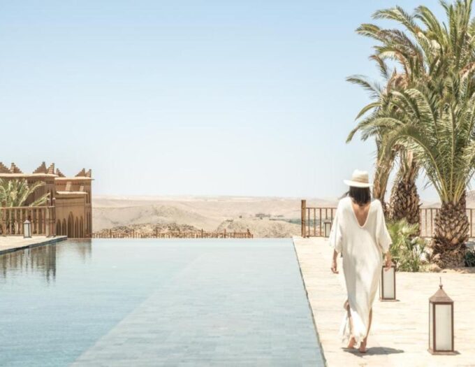 Le séjour se structure autour d’instants simples, guidés par le climat et la lumière. Le matin, un petit-déjeuner à la carte, continental ou sans gluten, est servi selon les préférences de chacun, dans une ambiance calme où l’on perçoit déjà la chaleur du jour. L’après-midi invite à la détente, entre baignade, lecture au bord de la piscine ou pause à l’ombre des murs ocres de la Kasbah. L’établissement propose également un spa, espace de repos qui prolonge naturellement l’esprit du lieu, avec une attention portée au bien-être et aux rituels de relaxation. Le soir, la terrasse devient un observatoire idéal pour profiter du ciel dégagé de la campagne marrakchie.