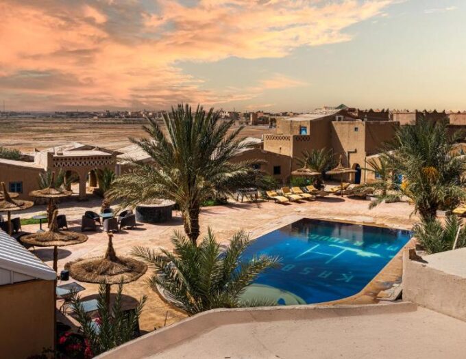 Au cœur de Merzouga, là où les premières dunes de l’Erg Chebbi s’élèvent comme des vagues figées par le vent, Kasbah Merzouga Lodge se dévoile comme un refuge chaleureux. Le lodge s’intègre dans un paysage façonné par la lumière, où les horizons varient en nuances dorées selon l’heure du jour. L’atmosphère de ce lieu se construit autour du silence du désert, de la sérénité des montagnes en arrière-plan et de la douceur des espaces aménagés pour la contemplation. Dès l’arrivée, le voyageur ressent une forme de déconnexion essentielle, comme un retour à une simplicité naturelle marquée par l’hospitalité du Sud marocain.