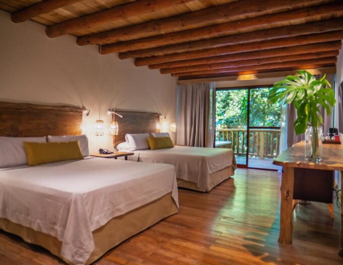 Des suites lumineuses, pensées pour la détente et l’intimité Chaque hébergement du La Aldea De La Selva Lodge adopte une esthétique noble et chaleureuse, où le parquet massif, les étoffes naturelles et les briques intérieures composent un cocon protecteur. Les chambres disposent de balcons privés équipés de hamacs, invitant à une déconnexion immédiate au-dessus de la jungle.