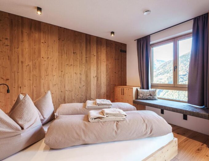 Chaque détail, du mobilier artisanal aux tissus naturels, a été choisi pour créer une atmosphère à la fois rustique et raffinée. La lumière matinale traverse les planches de bois blond, révélant des panoramas grandioses sur les montagnes du Plan de Corones (Kronplatz), à seulement 27 kilomètres.