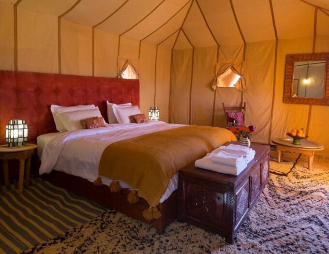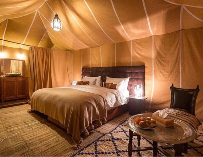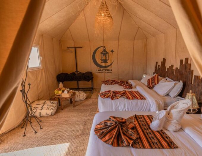Les tentes de Lantern Luxury Lodge incarnent un équilibre subtil entre authenticité saharienne et confort contemporain. Chaque hébergement dispose d’une salle de bains privative entièrement équipée, offrant un espace intime où la simplicité naturelle rencontre des touches de raffinement. Les matériaux, les textures et les tons choisis évoquent la terre, la lumière et la chaleur du désert. Les voyageurs profitent d’un confort rare, permettant de se ressourcer pleinement après une journée d’exploration. L’agencement intérieur privilégie la douceur et le calme, créant un cocon apaisant où le silence extérieur devient une part essentielle de l’expérience.