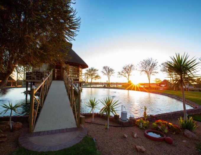 Dès l’arrivée au Lapa Lange Game Lodge, le regard est attiré par les jardins soigneusement entretenus, dont la fraîcheur contraste avec les étendues semi-arides environnantes. Les couleurs du Kalahari dominent, portées par des herbes dorées, des silhouettes d’acacias et une lumière qui change subtilement au fil des heures. Le lodge a été conçu pour accompagner cette atmosphère et offrir une expérience où la nature reste au centre du séjour.