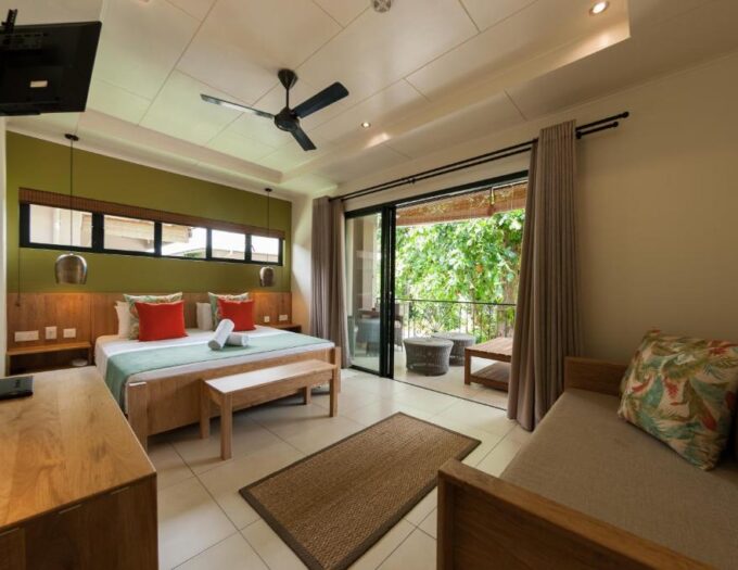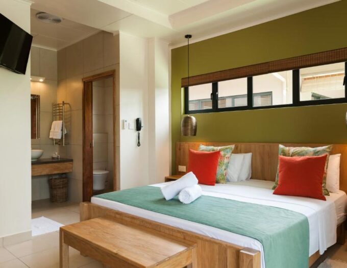 Situé à seulement 5 minutes à pied du centre du village et à moins de 10 minutes du port des ferries, Le Repaire Lodge bénéficie d’un emplacement idéal pour explorer La Digue tout en profitant d’une atmosphère paisible. L’hôtel, entouré d’un jardin tropical luxuriant, se fond harmonieusement dans le décor insulaire : cocotiers, sable fin et vue ouverte sur l’île de Praslin forment un tableau d’une sérénité rare.