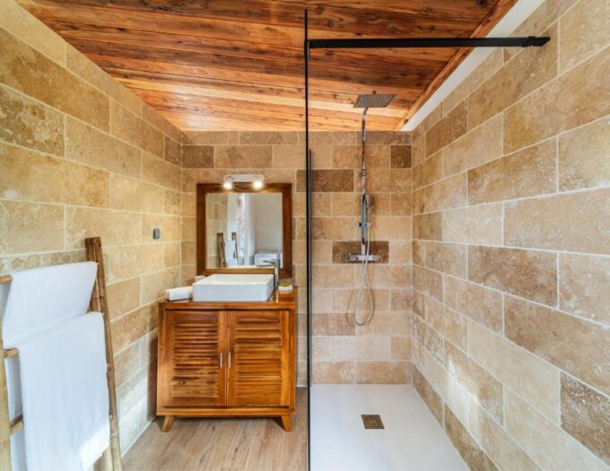 La terrasse constitue un autre espace de vie essentiel. On y partage un repas, on s’y accorde une pause lecture, ou on s’y installe simplement pour observer le mouvement lent des nuages sur les reliefs. Son orientation permet de profiter d’un climat doux et agréable tout au long de l’année, caractéristique de cette partie de l’île.