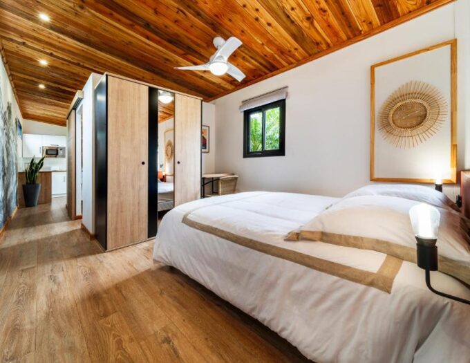 À l’intérieur, le lodge propose une atmosphère chaleureuse et fonctionnelle. L’appartement comprend une chambre confortable, un salon équipé d’une télévision à écran plat, et une cuisine complète avec réfrigérateur, lave-vaisselle et espace repas, idéale pour préparer un petit-déjeuner créole ou un dîner partagé.
