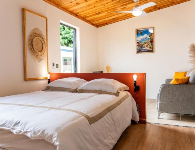 L’appartement du lodge bénéficie d’un emplacement privilégié avec vue sur la mer et la ville, offrant un spectacle changeant du lever au coucher du soleil. Le jardin, pensé comme un espace de détente, est conçu pour s’intégrer au paysage alentour : plantes tropicales, calme préservé, et une piscine privée qui devient rapidement le cœur du séjour. Baignée de lumière, elle est idéale pour des instants de repos après une journée d’exploration.