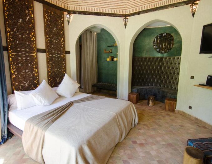 Le lodge s’inscrit dans une esthétique où les traditions marocaines rencontrent un confort contemporain. Les jardins entourant les hébergements créent une sensation de fraîcheur et de douceur, renforcée par la végétation soigneusement entretenue. La piscine, au cœur de l’espace extérieur, devient un lieu où l’on savoure la lumière du matin ou la clarté tamisée de l’après-midi. À l’intérieur, le style allie matériaux naturels, détails artisanaux et nuances chaleureuses, offrant une atmosphère à la fois élégante et apaisante.