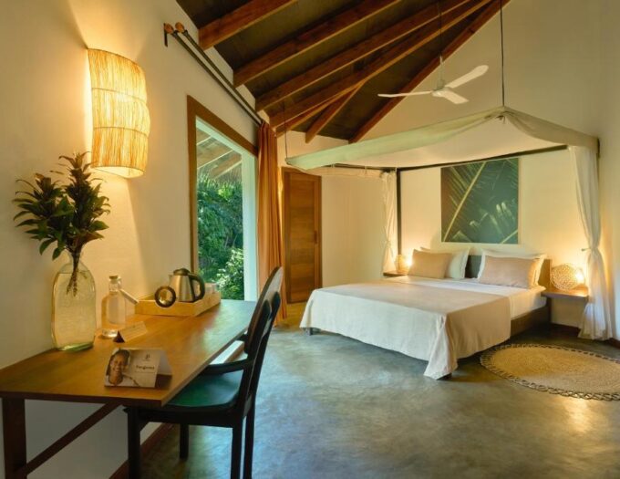 Les chambres sont conçues pour le confort moderne. Spacieuses et climatisées, elles sont équipées d’un minibar et d’un coffre-fort. Chaque chambre dispose du privilège d’une terrasse privée donnant sur la piscine et le jardin. Ces espaces extérieurs sont parfaits pour savourer le silence matinal et la lumière du jour. Des articles de toilette gratuits, un sèche-cheveux et un bureau sont également fournis, soulignant l’attention portée au détail et au confort.