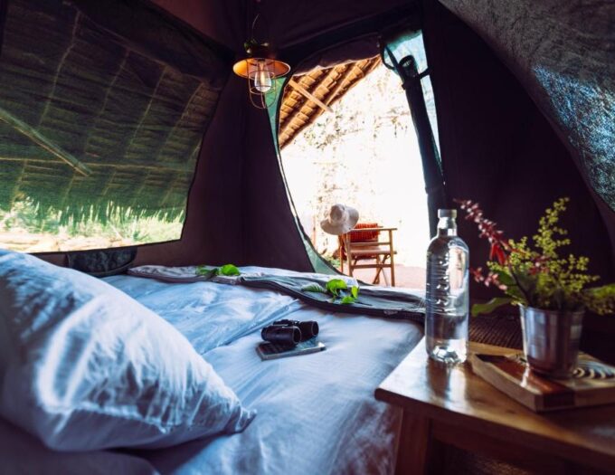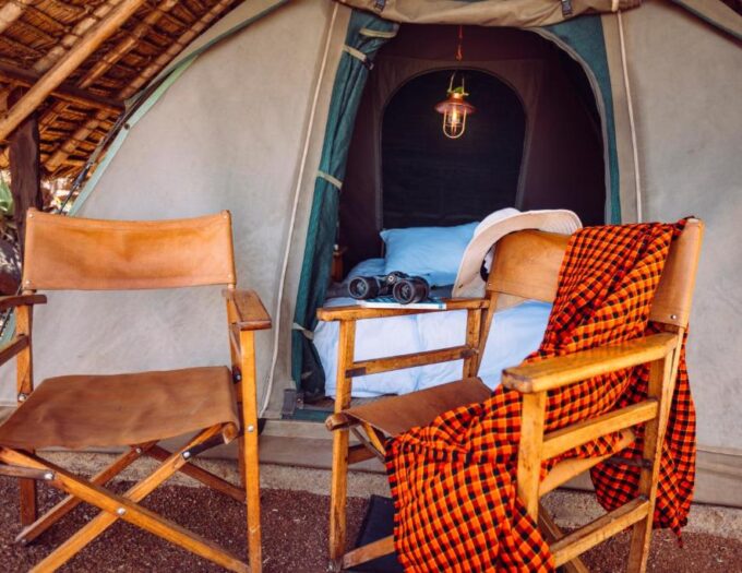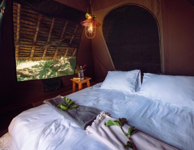 Le Maji Moto Eco Lodge propose des tentes de luxe aménagées avec goût et pensées pour un séjour confortable en pleine nature. Chaque tente dispose d’un coin salon accueillant, d’un bar et de commodités modernes, permettant de profiter d’un séjour relaxant après une journée d’aventure. Les espaces sont conçus pour offrir intimité et tranquillité, tout en favorisant une connexion harmonieuse avec l’environnement environnant. Les grandes ouvertures et terrasses des tentes permettent d’admirer les paysages alentours et d’observer la faune locale dans un cadre sécurisé.