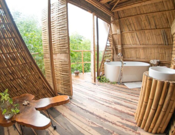 L’architecture du Mamasan Treehouses Lodge est une prouesse esthétique qui défie les standards classiques de l’hôtellerie. Les structures, inspirées des nids d’oiseaux et de la géométrie sacrée, utilisent le bois local, le bambou et des toitures en palme pour s’intégrer totalement à la végétation. L’idée centrale est de vivre en symbiose avec la jungle sans jamais la dénaturer. La conception privilégie de larges ouvertures et des matériaux poreux, permettant à la brise marine et à la lumière naturelle de sculpter l’espace intérieur tout au long de la journée.
