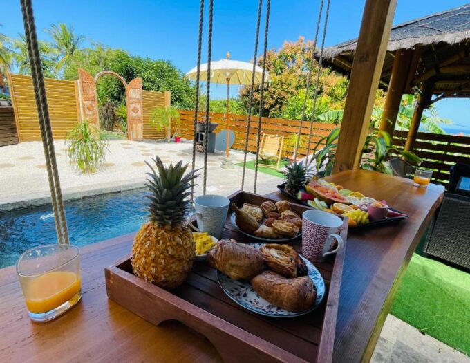 Le lodge s’ouvre naturellement sur ses extérieurs : jardin tropical, coin détente, piscine extérieure, terrasse conviviale… Le lieu semble pensé pour vivre autant en plein air qu’à l’intérieur. Le jardin, animé par le vent et la lumière océanique, invite aux petits-déjeuners lents et aux fins d’après-midi gourmandes. Quant à la piscine, elle devient rapidement le cœur du séjour, entre bains rafraîchissants, discussions au calme et moments de pure contemplation.