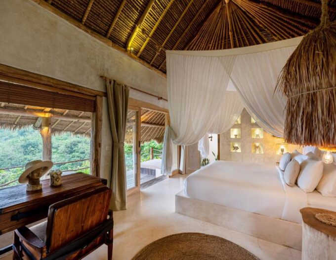 Chaque lodge dispose d’une terrasse privée avec vue panoramique sur l’océan, d’une salle de bains élégante et d’un mobilier sur mesure. Certains hébergements sont dotés d’une piscine à débordement privée, idéale pour admirer le lever du soleil sur la mer de Bali.