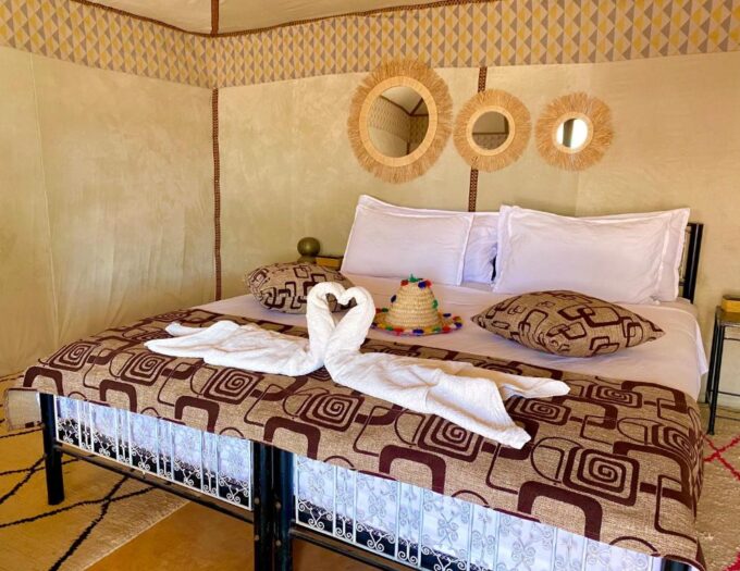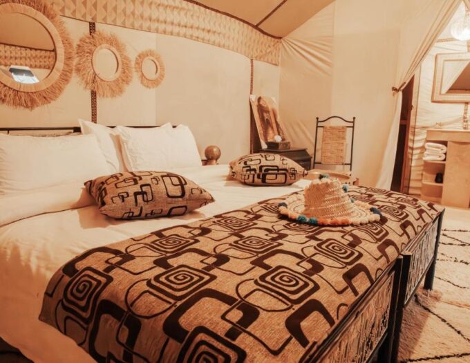 Les tentes, soigneusement aménagées, conjuguent confort contemporain et matériaux naturels. Mobilier artisanal, textiles marocains et lumières tamisées créent une atmosphère apaisante, pensée pour célébrer la simplicité raffinée du désert. Les lits confortables, les tissus doux et les touches décoratives inspirées de l’artisanat local invitent au repos. Chaque élément contribue à un sentiment d’harmonie, où luxe et sobriété dialoguent sans excès.