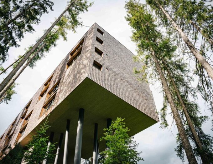 Le My Arbor Lodge tire son nom de “arbor”, l’arbre — et c’est bien là que tout commence. Construit sur pilotis, le bâtiment se fond dans la canopée, donnant l’impression de flotter parmi les cimes. Le bois brut, la pierre locale et les grandes parois vitrées dialoguent avec la lumière changeante des Dolomites.