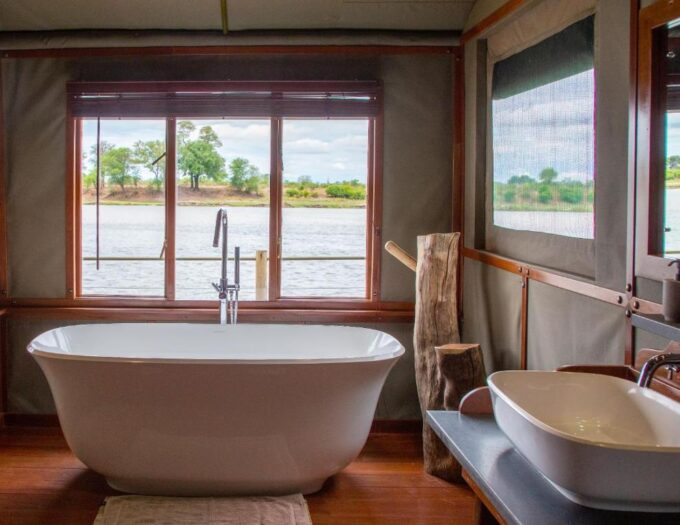 Le Ndhovu Safari Lodge propose des tentes équipées de vérandas privées qui donnent directement sur le fleuve. Chaque hébergement est conçu comme une parenthèse douce, où l’on profite du paysage sans barrière, avec la sensation d’être au cœur de la nature tout en restant confortablement installé. Les tentes disposent de parquet, d’une armoire, de moustiquaires et d’une salle de bains privative, un équilibre agréable entre esprit safari et modernité.