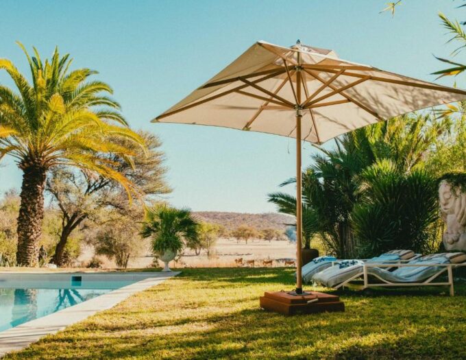 Dès que l’on pénètre dans l’enceinte du Ohorongo Safari Lodge, le rythme ralentit et la nature reprend immédiatement sa place. Le domaine s’étend autour d’un jardin soigné qui contraste avec la végétation semi-aride environnante. La piscine extérieure apporte une note de fraîcheur bien appréciée, particulièrement lors des journées où le soleil namibien se fait plus intense. Ombres, couleurs naturelles et silhouettes d’arbres forment un tableau apaisant.