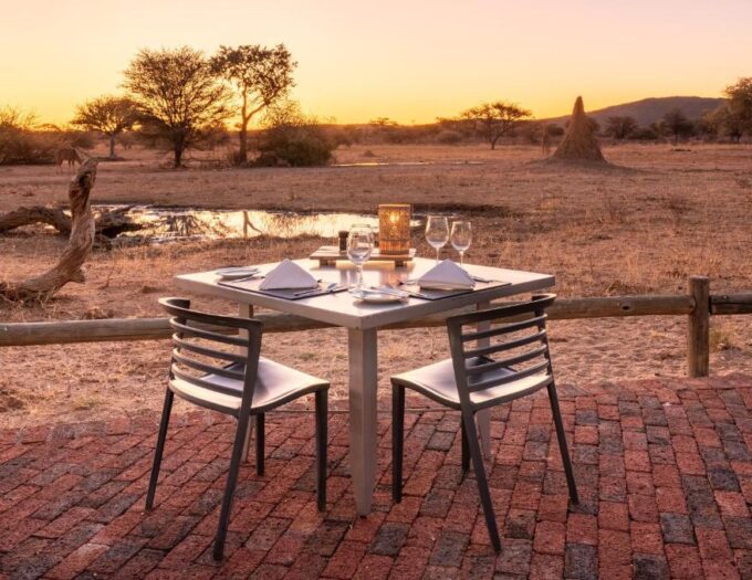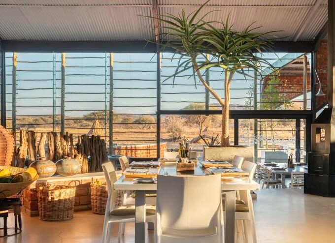 L’expérience culinaire au Okonjima Plains Lodge reflète la philosophie générale du lieu : sincérité, produits soigneusement sélectionnés et respect du terroir. Le restaurant met en avant une cuisine locale revisitée avec une touche contemporaine. Les repas sont servis dans un cadre spacieux et lumineux, toujours ouvert sur la plaine.