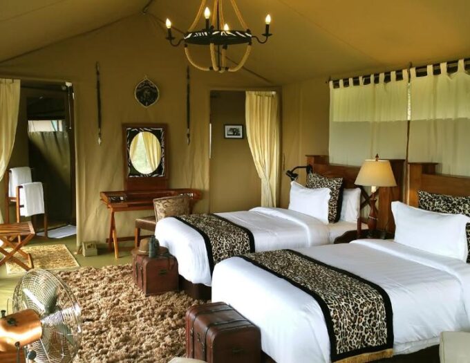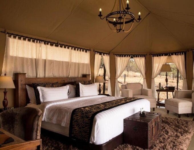 Les tentes de luxe du lodge sont conçues pour offrir un équilibre parfait entre intimité, confort et immersion dans la nature. Chaque tente est équipée de linge de lit et de serviettes, garantissant un séjour agréable et reposant. L’intérieur spacieux et soigneusement décoré offre une atmosphère chaleureuse avec des touches élégantes rappelant l’environnement naturel du Serengeti. Les grandes fenêtres et la terrasse privative permettent de profiter de vues panoramiques sur le cours d’eau et les plaines environnantes, permettant aux hôtes d’observer la faune locale depuis le confort de leur hébergement.