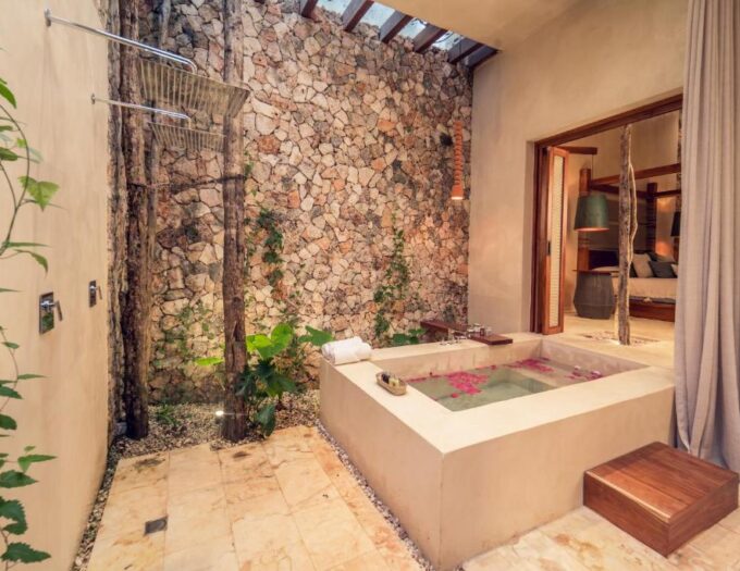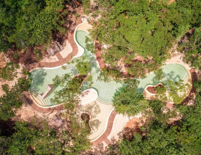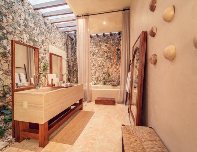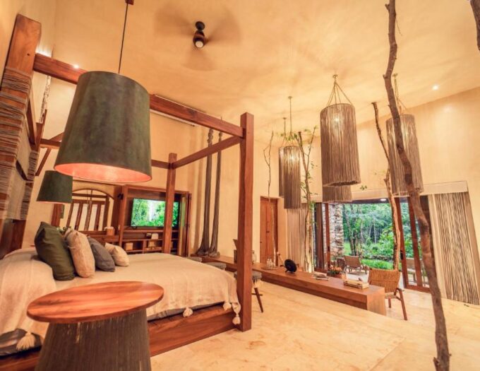 L’architecture de l’Oriundo Lodge est une prouesse d’intégration paysagère. En utilisant des matériaux locaux tels que la pierre de calcaire et le bois tropical, les villas semblent flotter au-dessus du sol forestier, minimisant leur empreinte sur l’écosystème. La conception privilégie de vastes volumes ouverts et des lignes épurées qui guident le regard vers la nature. La lumière du soleil mexicain est ici traitée comme un matériau de construction à part entière, pénétrant dans les espaces de vie à travers de larges baies vitrées pour créer un jeu d’ombres et de clarté en perpétuel mouvement.