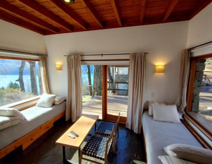 Les terrasses ouvertes sur le lac, les soirées au coin du feu et la simplicité élégante des espaces communs composent une parenthèse romantique faite de calme et de contemplation. C’est un lieu pour se retrouver, naviguer sur les eaux du lac Lácar, observer les reliefs et partager des moments suspendus dans un cadre unique.