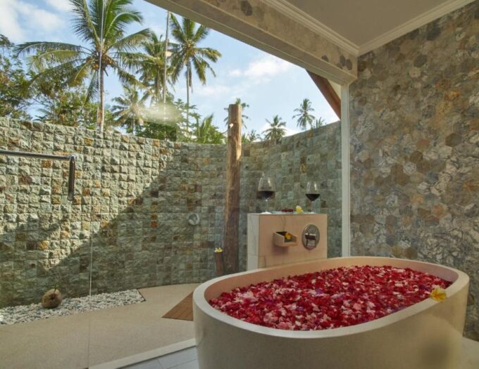 À l’extérieur, le jardin luxuriant encadre une grande piscine où il fait bon se relaxer, tandis qu’un bain à remouscomplète cette expérience de bien-être. Les terrasses communes et les espaces ombragés invitent à la contemplation ou à la lecture, bercés par la brise du mont Agung.