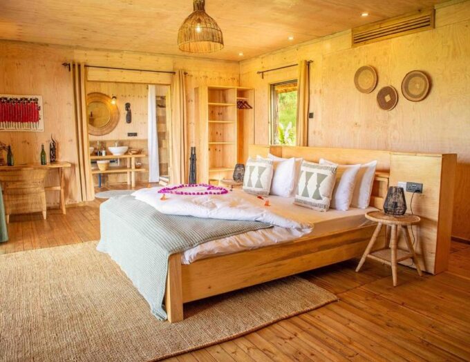 Le design des espaces communs est chaleureux et invitant. Le Lodge dispose d’un jardin, d’une terrasse et d’un salon commun, des lieux qui favorisent la convivialité et la détente dans le silence. La piscine extérieure est un ajout bienvenu, offrant un lieu de fraîcheur et de contemplation. Cet espace, harmonieux et bien aménagé, permet de se reposer après une longue journée de route ou de safari.