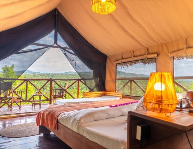 L’architecture du Rhotia Valley Lodge est celle d’un camp de tentes de luxe, une structure qui honore la tradition du safari tout en offrant un confort contemporain. Les tentes sont conçues pour maximiser l’expérience en plein air. Chacune dispose d’un balcon privé, permettant aux hôtes de s’immerger dans la nature et de contempler la vue sur la montagne environnante, souvent baignée de la lumière matinale.