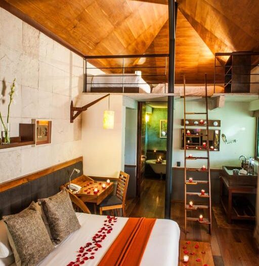 Les hébergements sont des sanctuaires de confort et de sérénité. Chaque suite est pensée comme un refuge intime où la modernité du mobilier dialogue avec la rusticité de l’environnement. Le parquet chaleureux, les textiles aux couleurs terreuses et les cheminées privées créent une atmosphère de « luxe décontracté ». Depuis votre terrasse suspendue, l’horizon se limite à la verticalité des arbres et à l’éclat argenté du lac privé, offrant un sentiment de solitude privilégiée. La salle de bains, véritable espace de soin, prolonge cette expérience de bien-être, permettant de se ressourcer dans une eau pure au cœur du monde végétal.