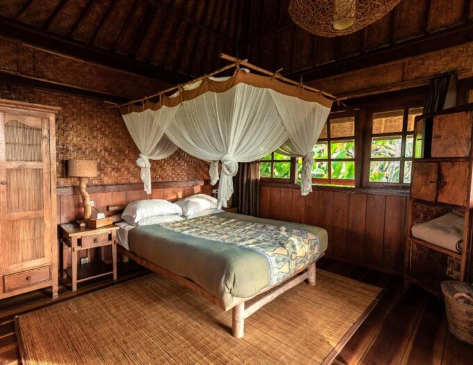 Les bungalows du Sarinbuana Eco Lodge sont conçus pour se fondre dans leur environnement. Construits en bambou, en bois et en pierre volcanique, ils offrent une architecture typiquement balinaise, respectueuse de la terre.