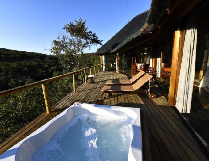 Les suites du lodge sont élégamment décorées, avec des tons naturels et des matériaux chaleureux, mêlant design contemporain et authenticité locale. Chaque hébergement dispose d’un coin salon avec cheminée, d’une salle de bains privative avec baignoire et douche à l’italienne, ainsi que d’un jacuzzi privé sur la terrasse. Les vues panoramiques depuis ces terrasses permettent d’observer la faune de la réserve dès le lever du soleil, offrant une expérience unique et immersive. L’atmosphère générale du lodge allie intimité et convivialité, avec des espaces communs élégants et un salon confortable où les hôtes peuvent se retrouver après les safaris.