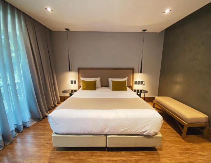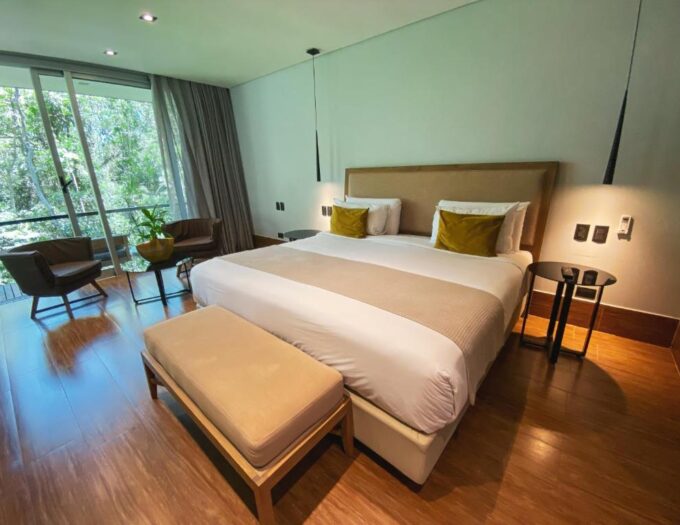 Des suites lumineuses, pensées pour la détente et l’intimité Chaque hébergement du Selvaje Lodge Iguazu adopte une esthétique épurée et organique, où le bois noble et les larges ouvertures composent un cocon protecteur. Les chambres, climatisées, offrent un balcon privé agissant comme un poste d’observation privilégié sur la forêt tropicale environnante.