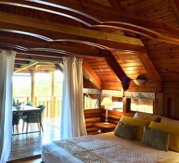 Le coin nuit et le coin salon se prolongent vers l’extérieur grâce à de grandes ouvertures, invitant la brise marine à entrer naturellement dans la pièce. La connexion Wi-Fi permet de rester connecté au besoin, sans compromettre l’ambiance reposante du lieu.