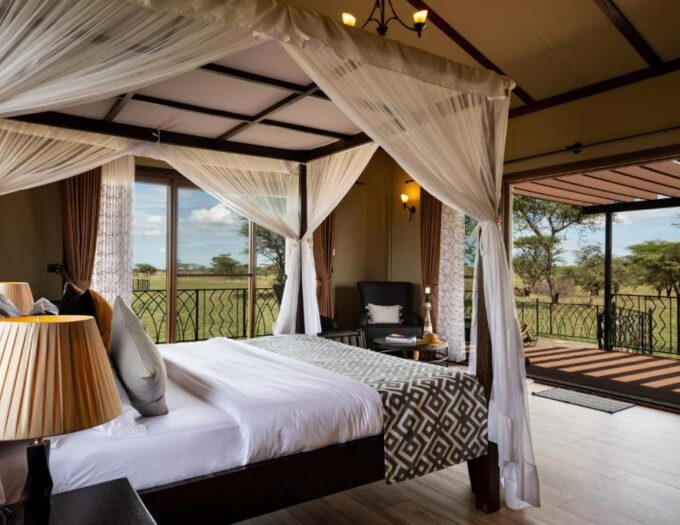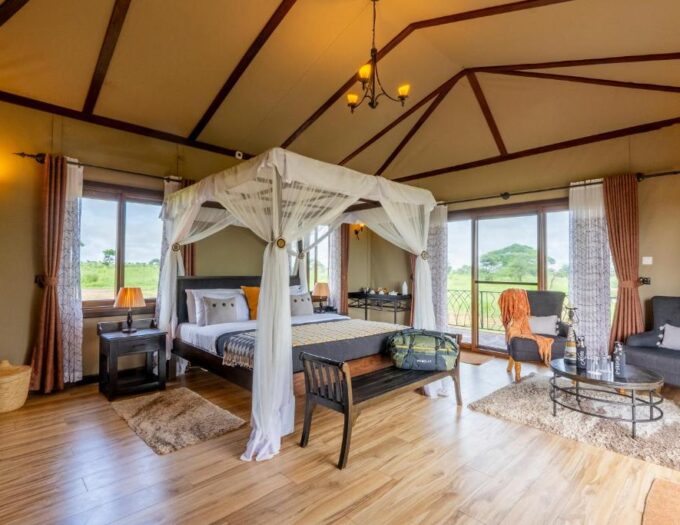 L’architecture du Serengeti Sametu Lodge est celle d’un campement de luxe conçu pour l’harmonie avec son environnement. Les structures de tentes, robustes et élégantes, préservent l’esprit du safari classique tout en offrant un niveau de confort contemporain et soigné. Le design privilégie les matériaux naturels et les tons neutres qui se fondent dans l’horizon doré de la savane.